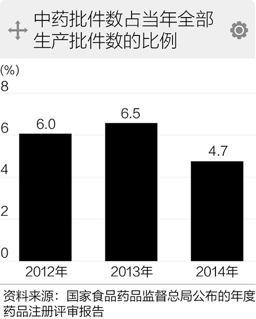“中成药产业在我国三大成品药市场当中的份额已经接近30%,包括中药饮片,总规模近4000亿,但是有一组数据着实令人担忧,国家食品药品监督总局公布的年度药品注册评审报告,2012、2013、2014年当中中药获生产批件的数量分别是37、27、24,占当年全部生产批件数的6.0%、6.5%、4.7%,且呈现逐年下降趋势。”全国人大代表、中国工程院院士、天津中医药大学校长张伯礼昨日谈道。